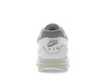 This striking design features a premium blend of materials. A pristine white leather base is complemented by a subtly textured, blue-tinted grey mesh. A unique wavy leather overlay adds a distinctive visual element, sitting atop cream-colored Air Max bubble midsoles for optimal comfort and cushioning. The shoe is finished with a clean white waffle outsole.