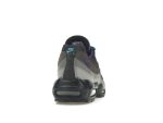 The shoe’s upper showcases a gradient of greys and blacks, creating a dynamic and visually striking look. Cascading overlays in various shades of grey and black add depth and texture. The tongue boasts multicolor Air Max branding and incorporates Court Purple near the collar, transitioning to black towards the vamp. Light Teal Nebula accents the webbed eyelets, adding a pop of color against the darker tones.