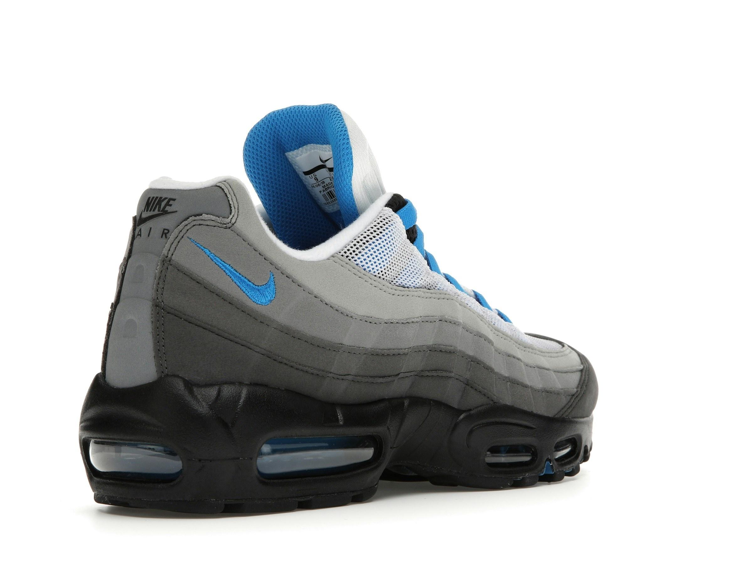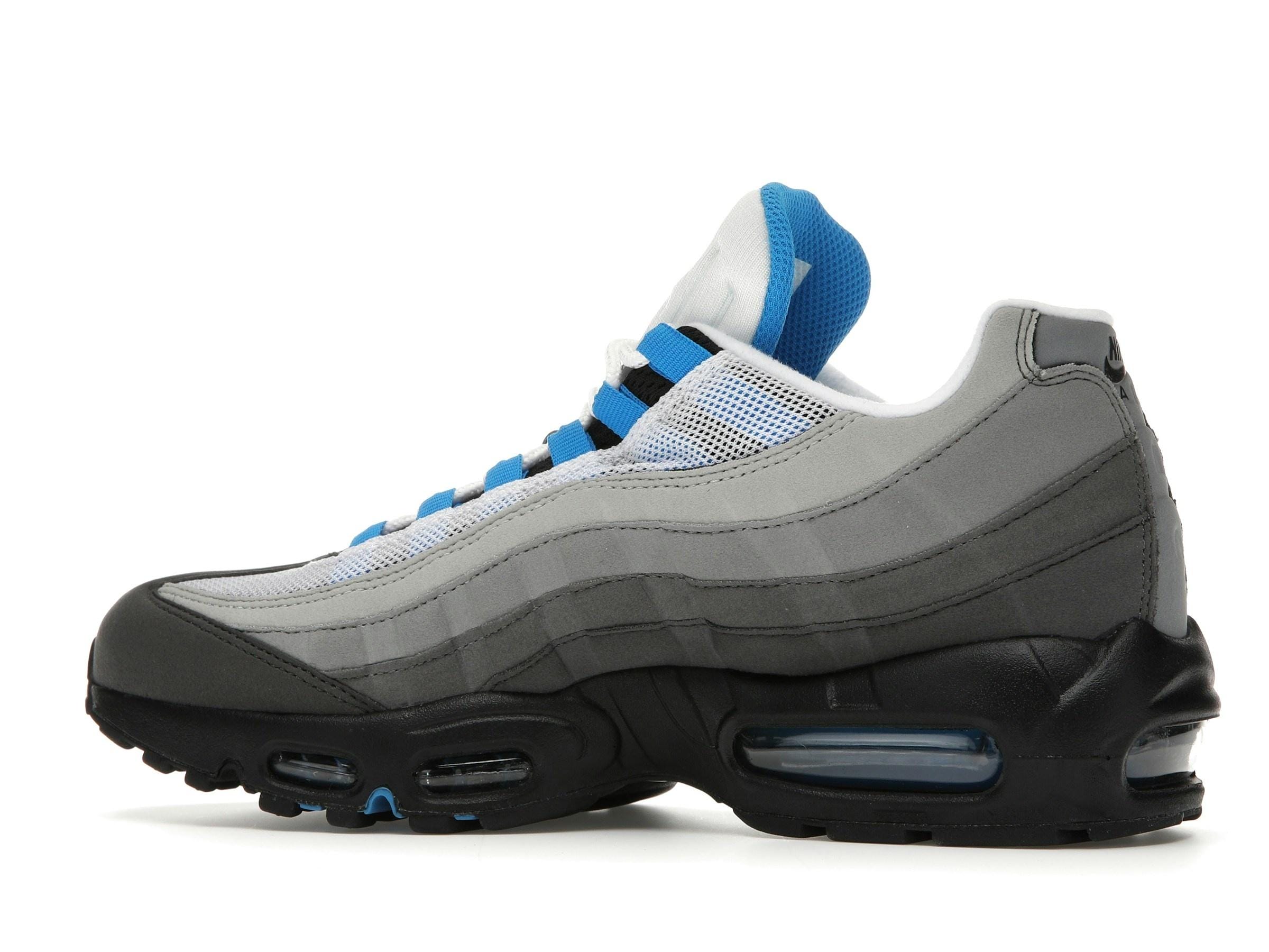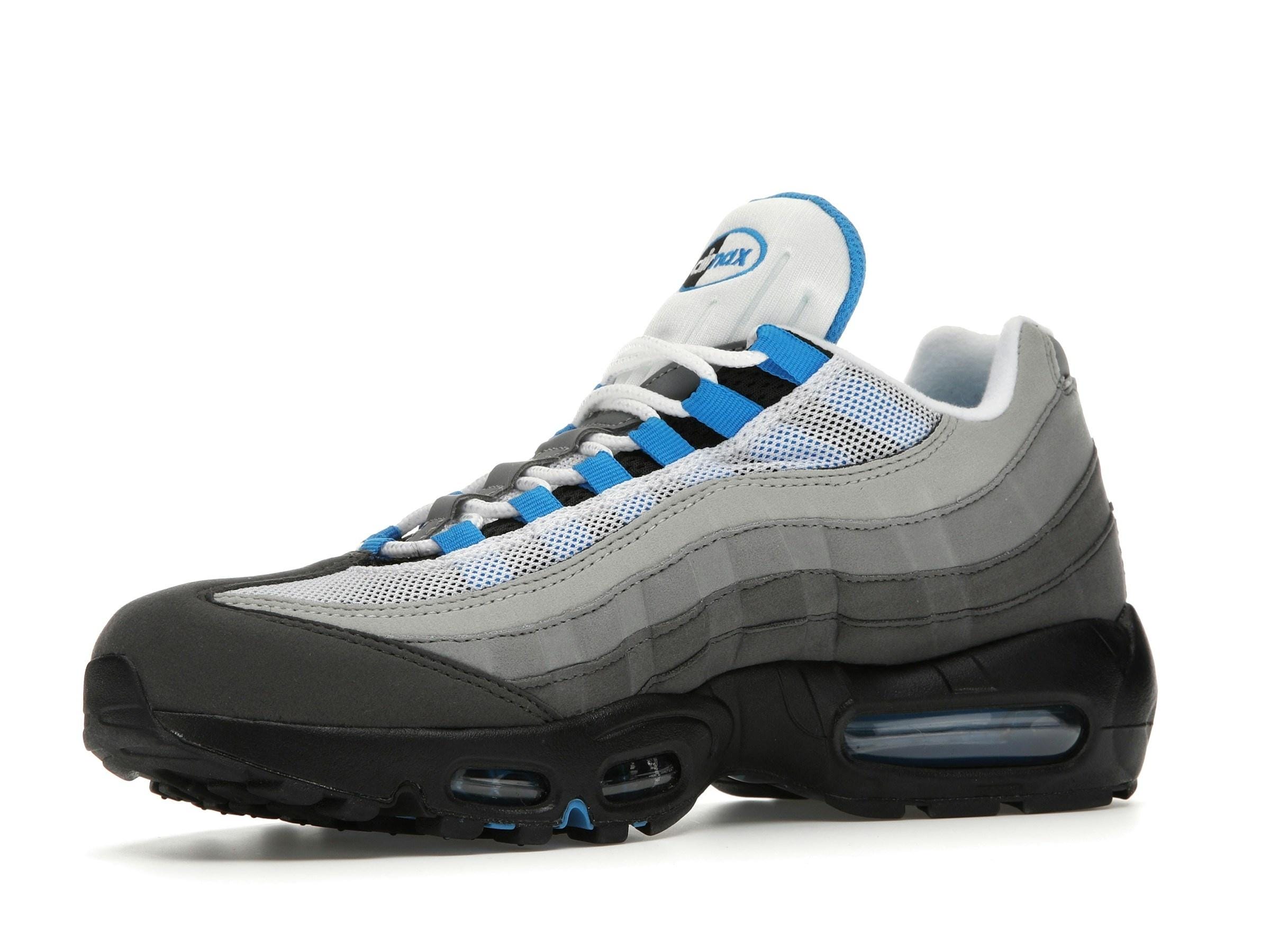 Iconic Nike Air Max 95 OG Crystal Blue trainers (AT8696-100). Original 2018 release. Features gradient greys, crystal blue accents & visible Air units. Premium comfort & style. A must-have for collectors.