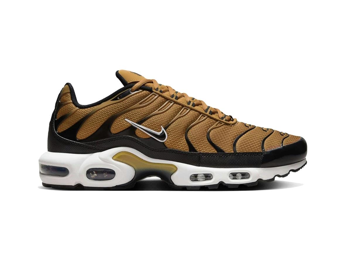 The Nike Air Max Plus Golden Harvest features a premium blend of materials, combining durable leather and breathable mesh for optimal performance and lasting comfort. The eye-catching color scheme is accented by subtle Gum Light Brown and Black details, adding depth and sophistication to the design. These details create a unique contrast against the warm tones of the Wheat upper.