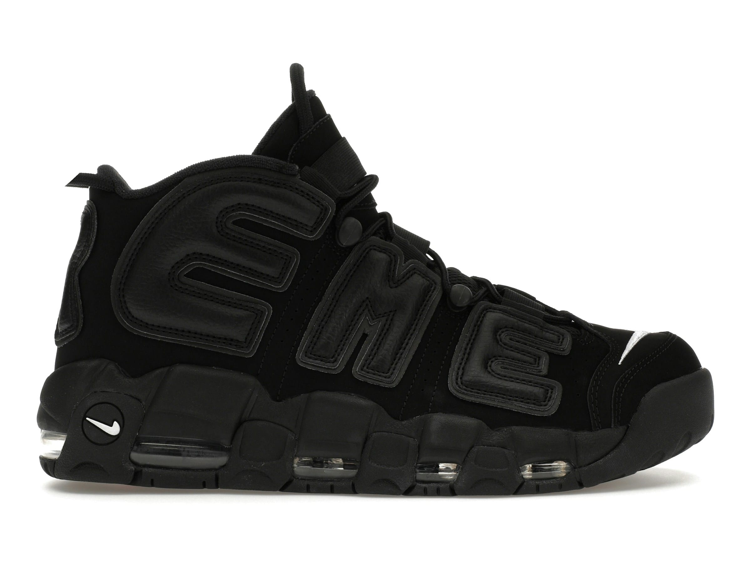 Details include a crisp white Nike Swoosh subtly placed on the toe box and sides of the midsole, offering a perfect contrast against the black upper. The Air More Uptempo Supreme Suptempo Black, originally released on April 27, 2017, remains a highly sought-after collector’s item and a staple for sneaker enthusiasts. Its blend of classic design and modern comfort makes it a timeless choice.