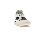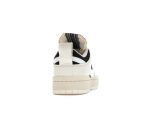 The shoe features a striking two-tone color scheme of pale ivory and black. Premium leather overlays in a soft, off-white pale ivory shade grace the midfoot, heel, and forefoot, contrasted beautifully by darker black underlays. Clean white laces and a subtle white collar lining complete the sophisticated look. The iconic Nike Swoosh is subtly integrated, adding to the shoe’s understated elegance. A distinctive barcode design and Nike branding details add a unique touch.