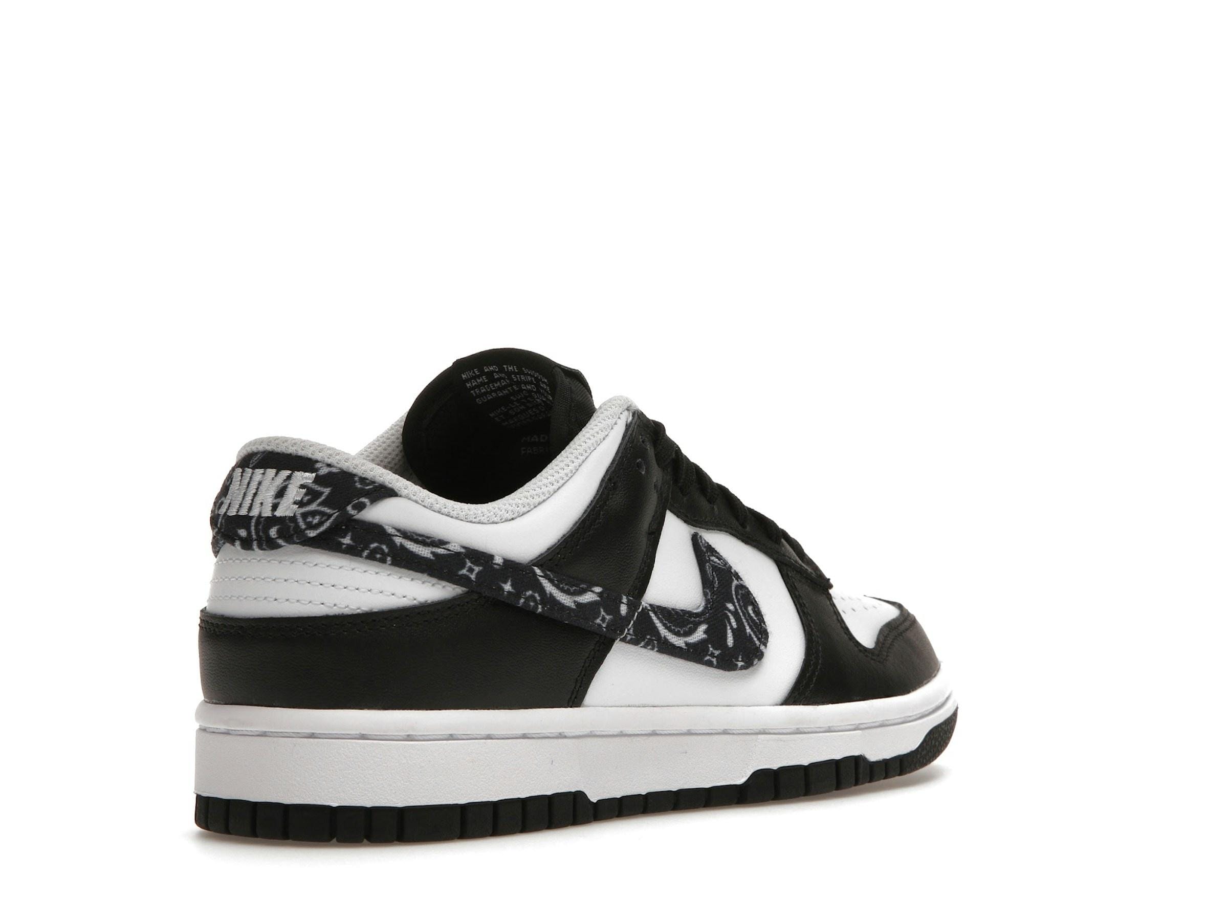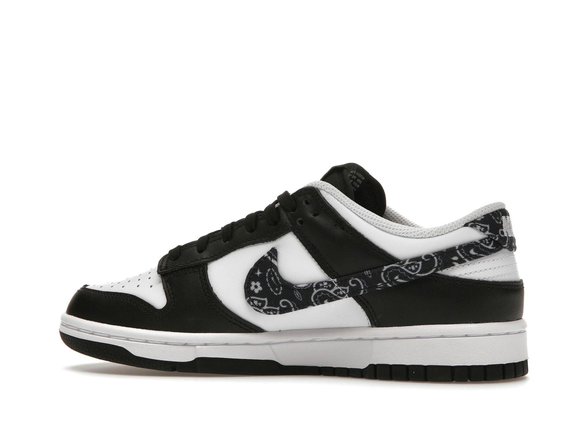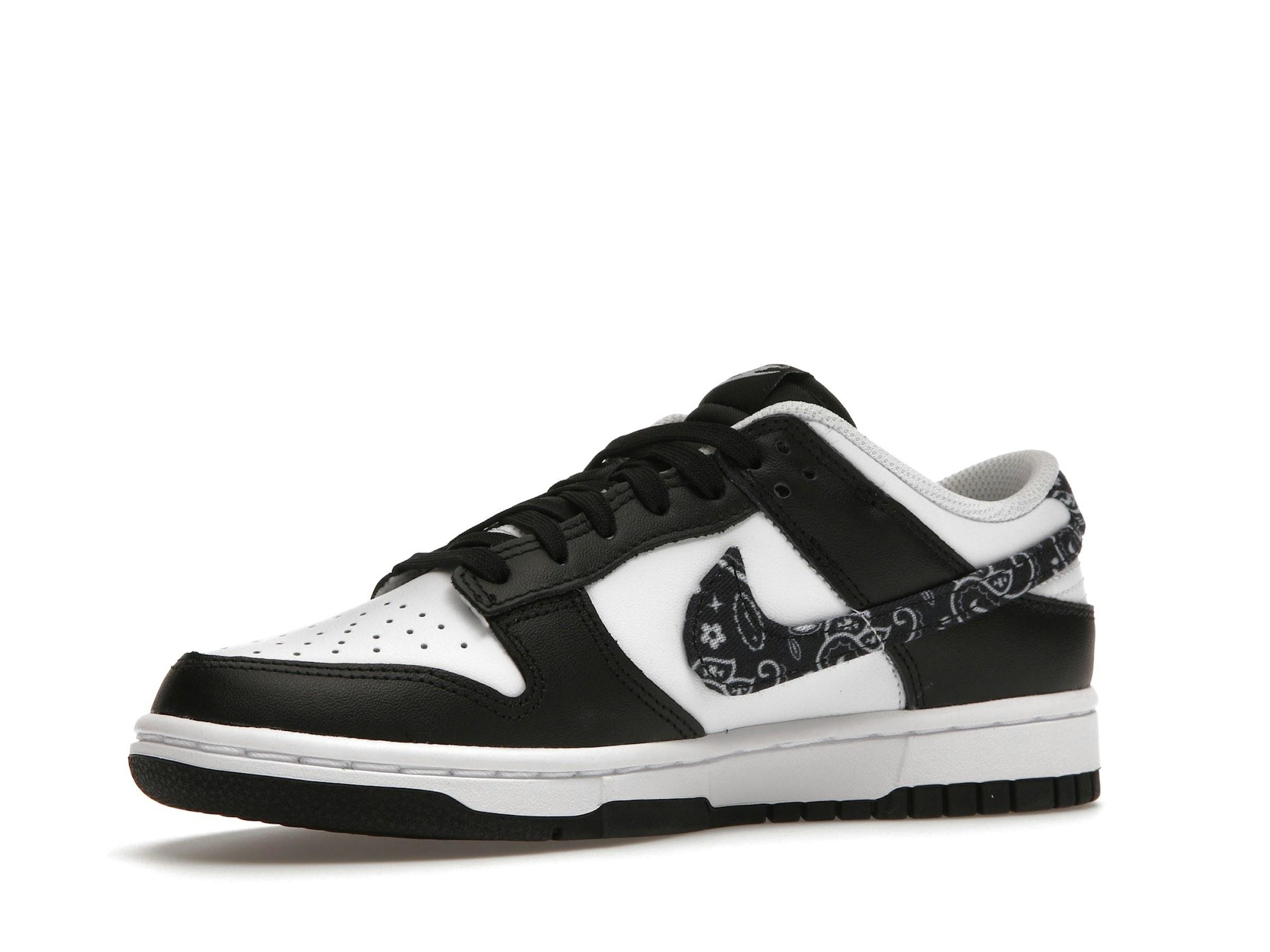 Crafted with premium materials, the shoe features a crisp white leather base that provides a clean canvas for the contrasting black leather overlays. This sophisticated colour blocking is further accentuated by black detailing on the nylon tongue, laces, insole, and rubber outsole, creating a cohesive and stylish look. The signature paisley bandana print adorning the Swooshes and heel tabs adds a unique, eye-catching touch, setting these Dunks apart from the rest.