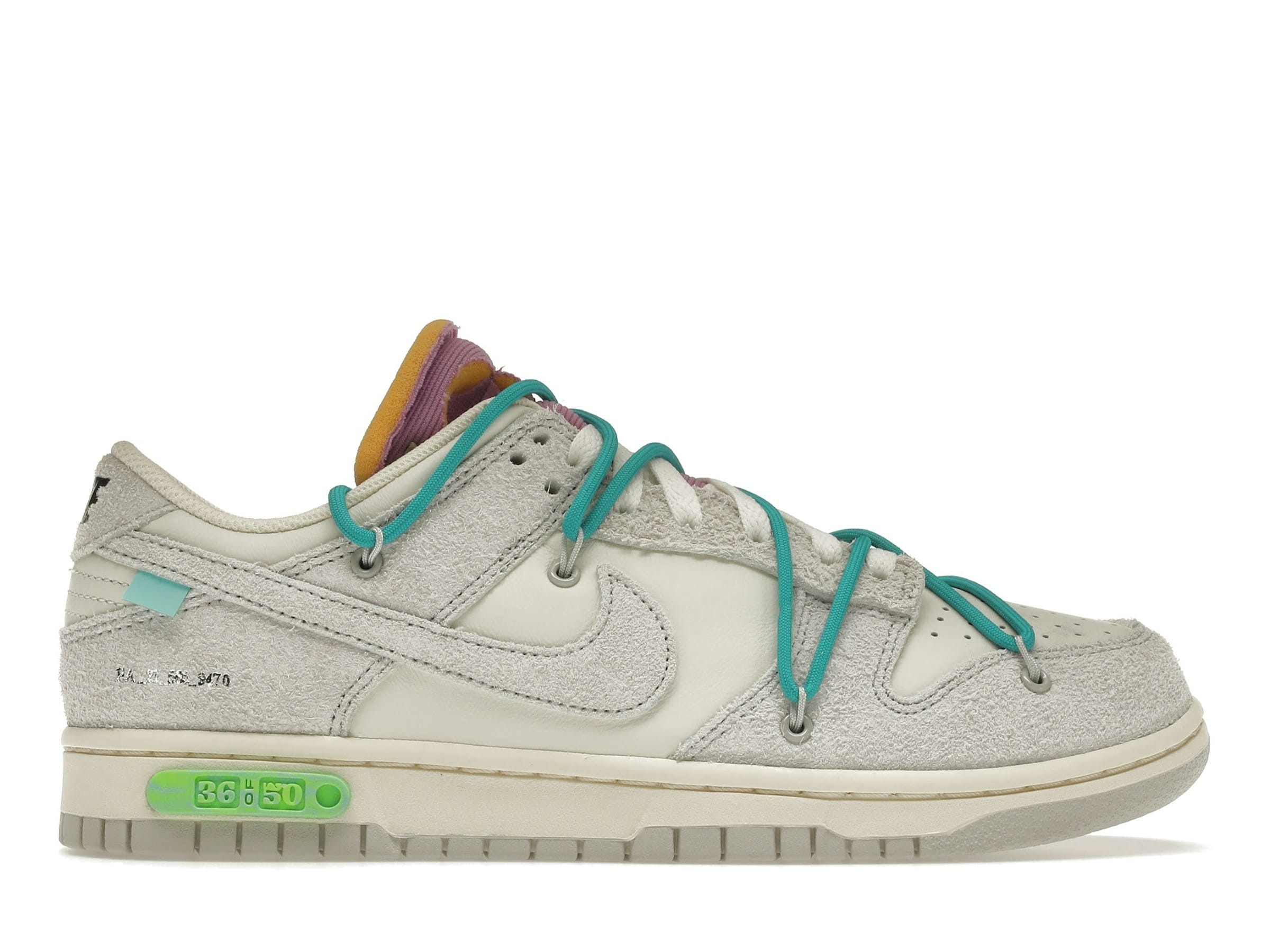 Nike Dunk Low Off-White Lot 36 (DJ0950-107). Virgil Abloh’s deconstructed design features a Sail colorway, premium leather/suede, and interchangeable laces. A collectible sneaker blending classic style with modern flair.