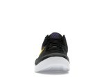 The sleek black engineered knit upper provides a comfortable and supportive fit, while the vibrant University Gold and Court Purple accents pay homage to the Lakers’ away uniform. Gold embroidered Nike swooshes and Kobe’s signature on the heel add a premium touch. The white outsole offers a clean contrast against the black midsole, completing the sophisticated design.