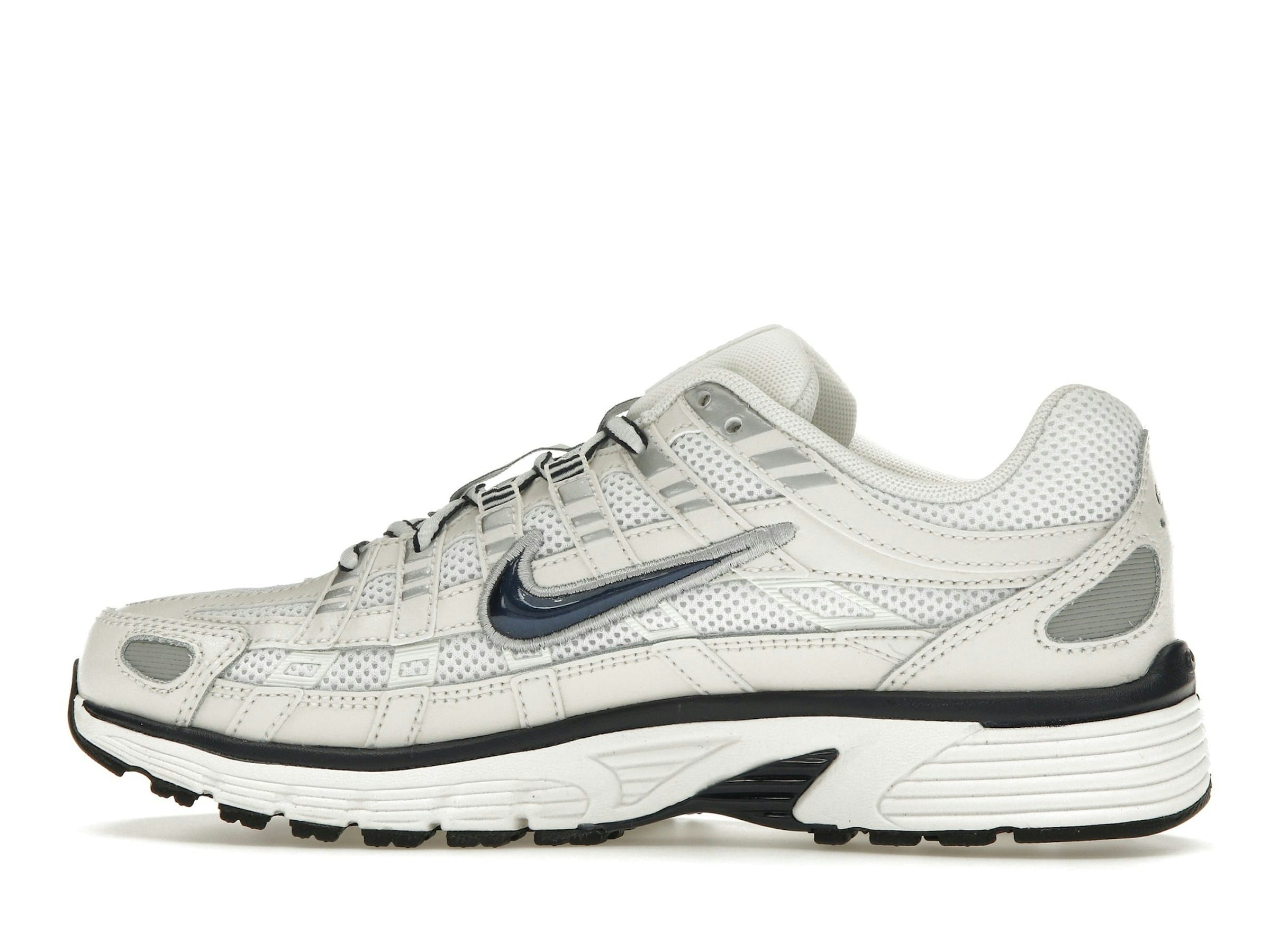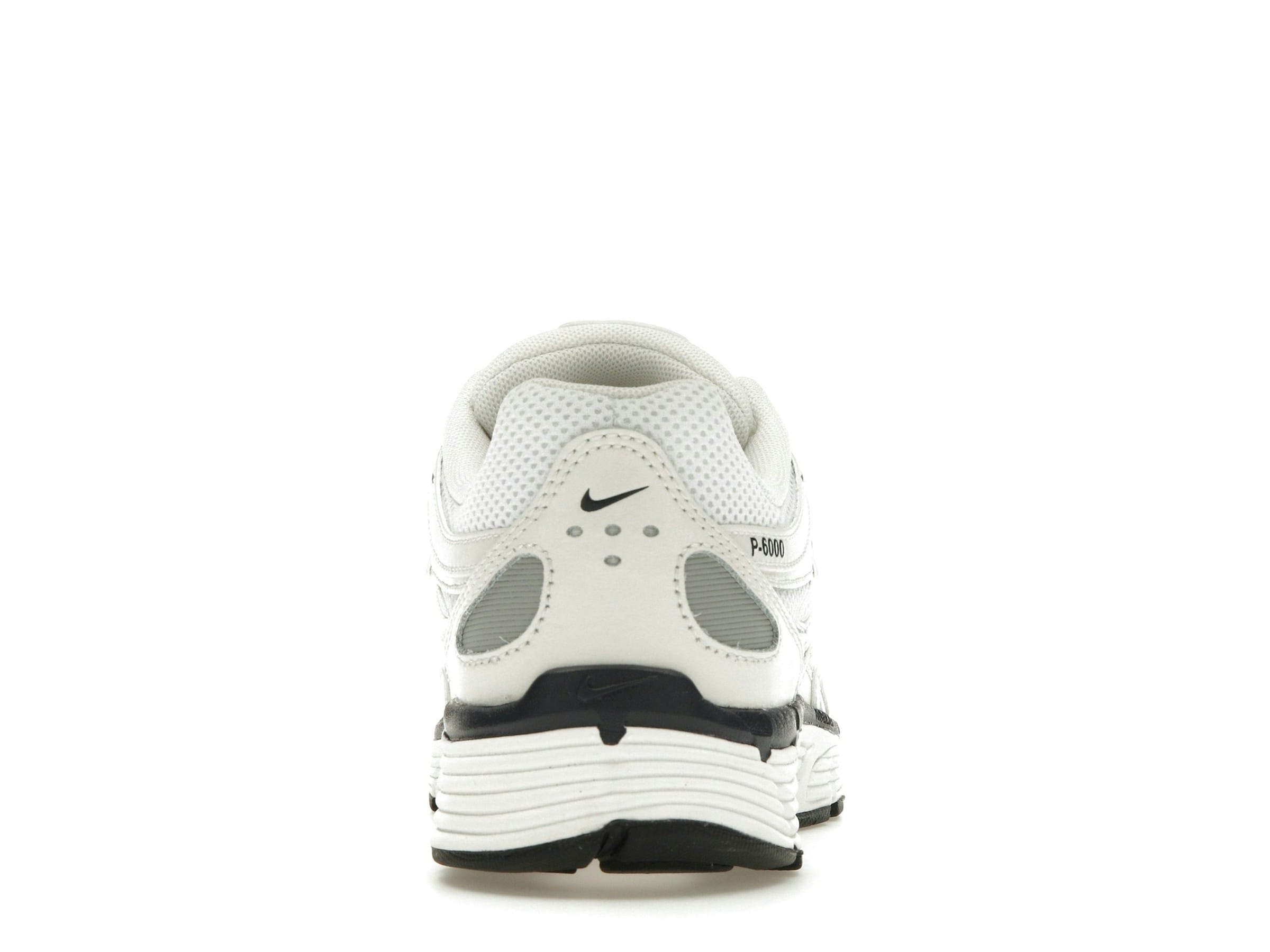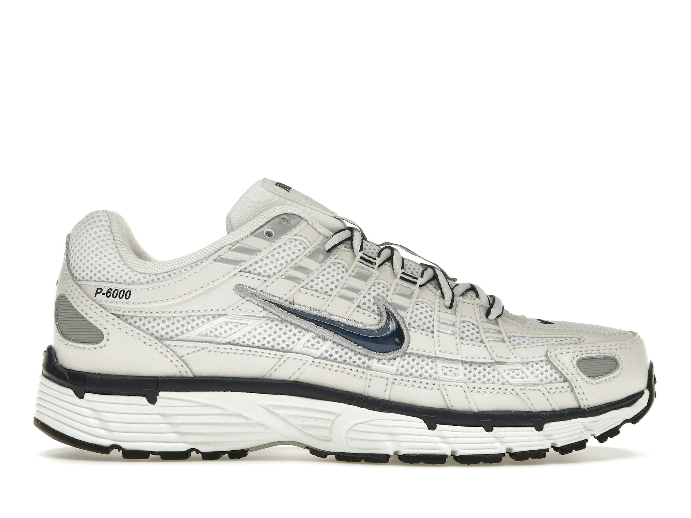 The shoe’s color scheme features a predominantly white upper, accented by contrasting Obsidian details. These Obsidian accents appear on the iconic Swoosh logo, the rubber outsole, the laces, the “NIKE” lettering on the tongue, the heel Swoosh, and the “P-6000” branding on the overlays. This creates a visually appealing balance between clean white and bold dark accents.