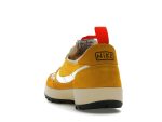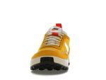 The shoe’s upper features a durable yellow mesh construction, accented by tonal suede overlays for added support and texture. A crisp white swoosh provides a striking contrast, while orange heel and tongue tabs ensure easy on and off. The design is both practical and visually captivating, reflecting Tom Sachs’ signature blend of artistry and utility.