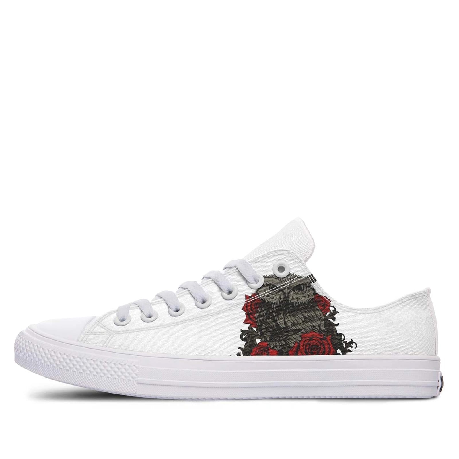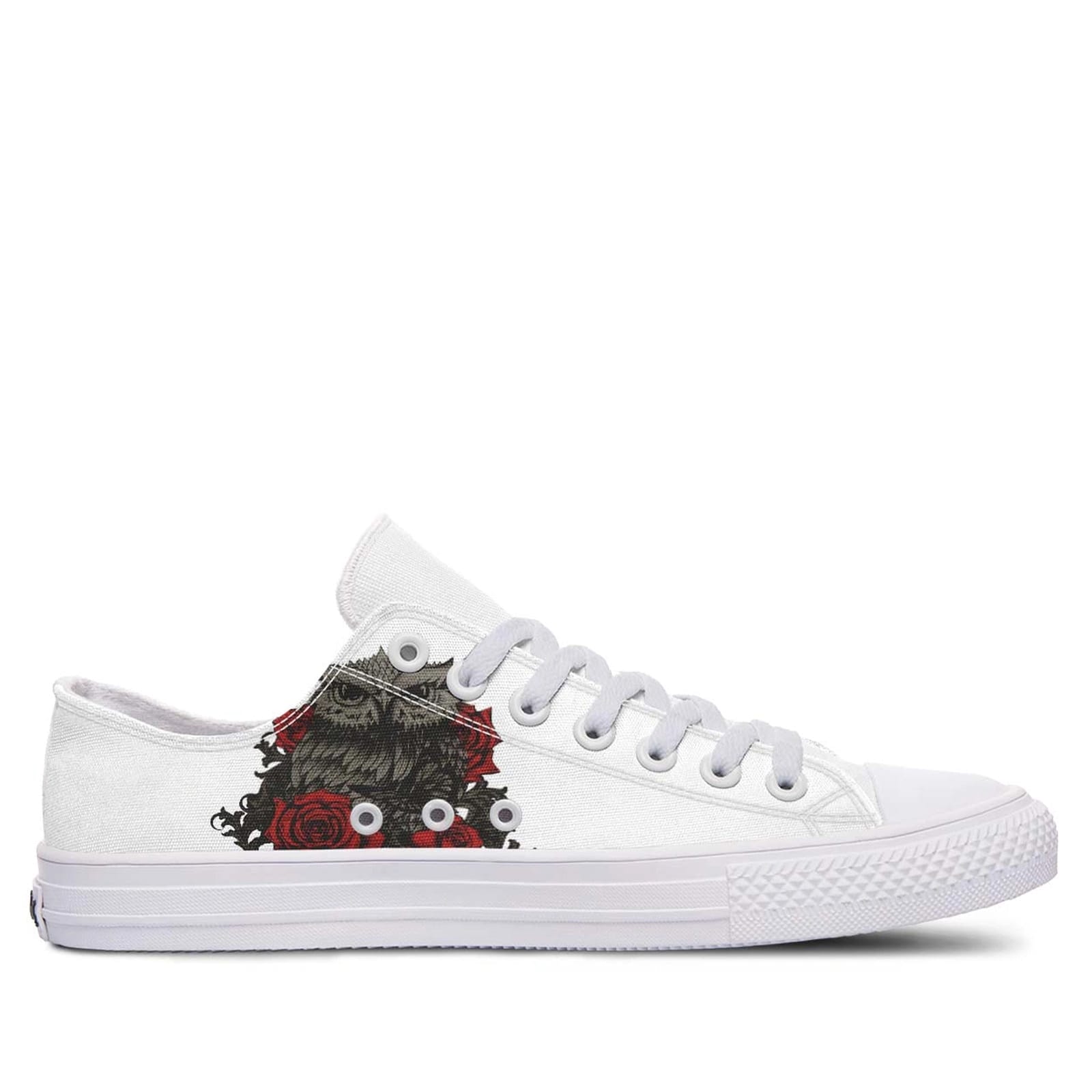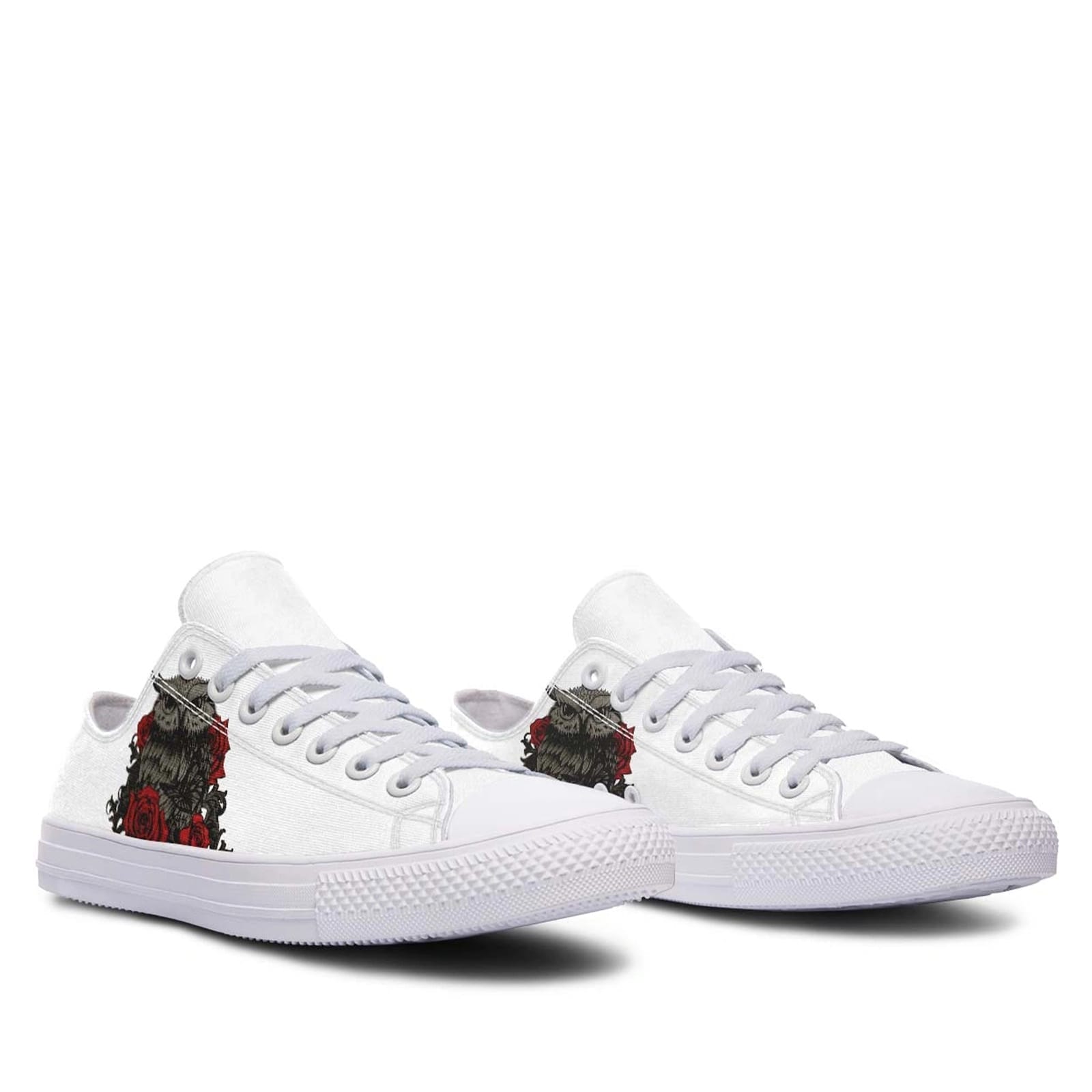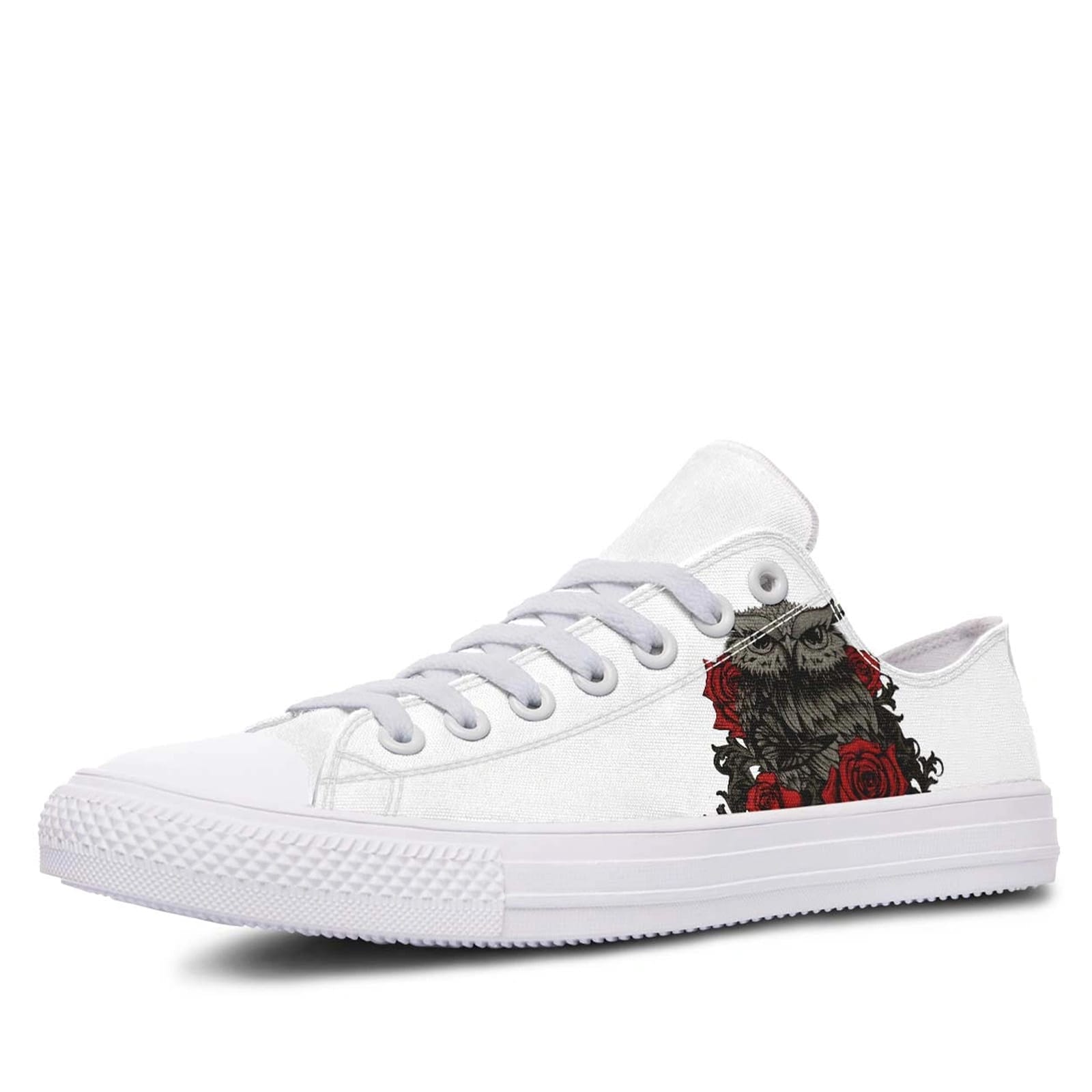 Embrace the enchanting blend of nature and elegance with our Owl and Rose White Lowtop Sneakers. These sneakers are meticulously designed to combine artistic flair with everyday comfort, making them a unique addition to any footwear collection. Featuring a charming owl and rose print on a pristine white canvas, these sneakers capture the essence of both wildlife and floral beauty, setting you apart with a sophisticated yet whimsical style.