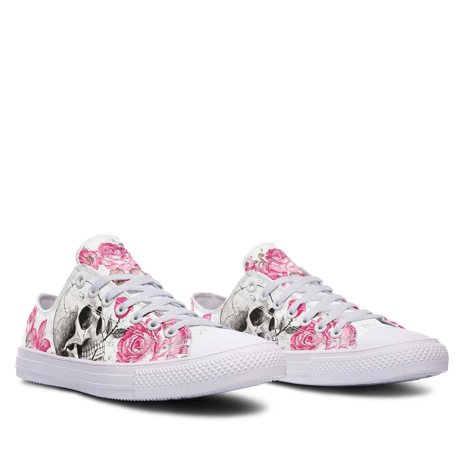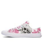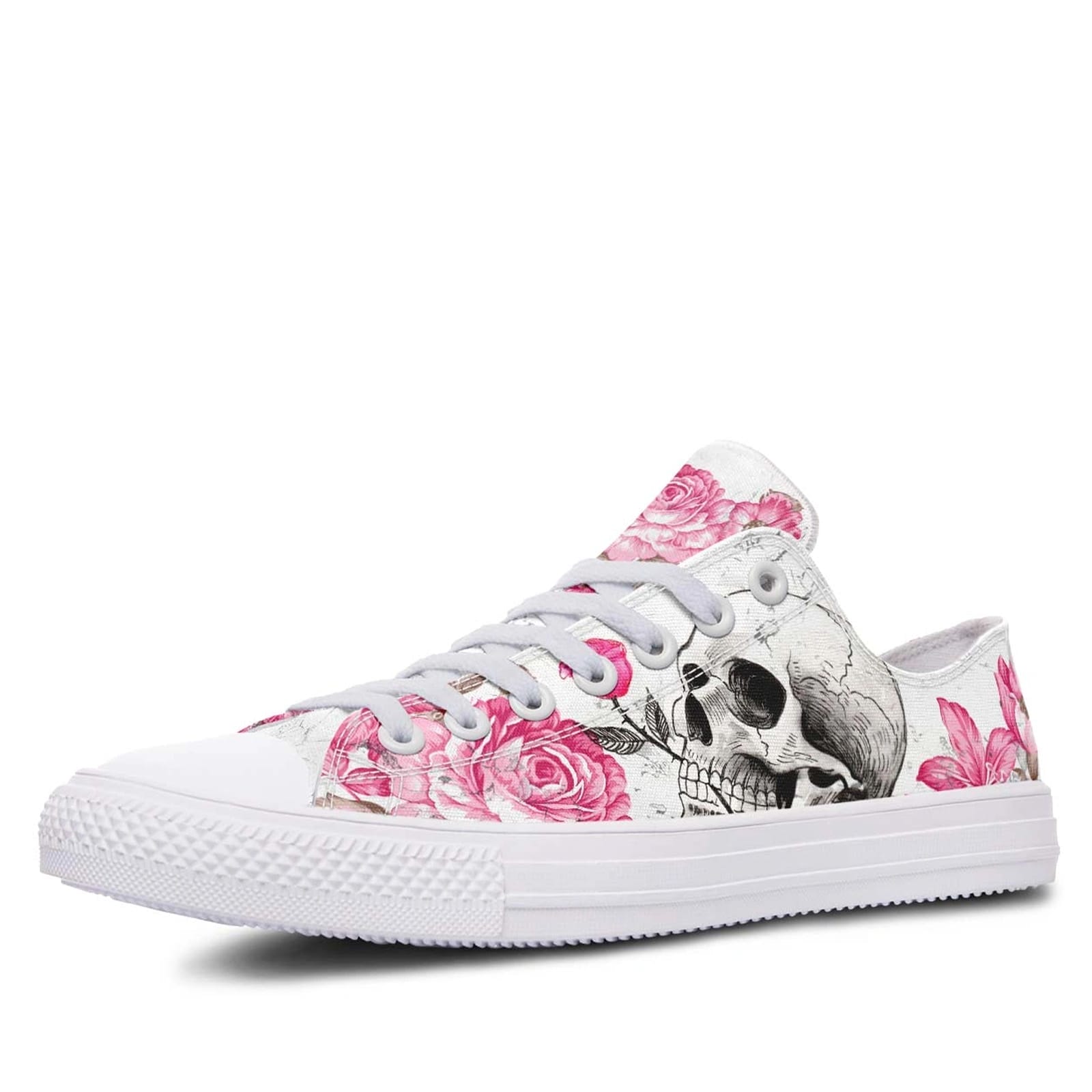 The Skull with Pink Flower Pattern White Lowtop Sneakers are a must-have for anyone looking to infuse their footwear collection with personality and style. With their comfortable fit and eye-catching design, these sneakers are as practical as they are stylish.