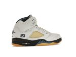 Iconic Jordan 5 features remain intact, including the instantly recognizable shark teeth design along the midsole and the prominent “23” branding on the heel. However, unique design elements elevate this iteration, such as a gleaming metallic silver tongue and a slimmed-down collar for a refined silhouette. The pre-yellowed quarter panel netting adds a touch of vintage flair, perfectly complementing the overall aesthetic.