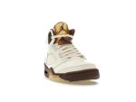 The distinctive shark tooth detailing on the midsole and the visible Air-sole unit in the heel are hallmarks of the Jordan 5 design. The ‘Earth’ colorway, with its blend of off-white, dark brown, metallic gold, and sail, offers a sophisticated and earthy palette that’s both timeless and trendy. These Jordan 5s are more than just sneakers; they’re a statement of style and a celebration of basketball history.
