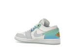 Luxury details elevate this Jordan 1 Low to new heights. Subtle golden accents, including a Wings logo on the heel, an embroidered Jumpman on the toe box, and gold-colored metal eyelets, provide a touch of refined elegance. The white mesh tongue features a tonal Jumpman logo, and the insole boasts the letters “ER,” adding a personalized touch.